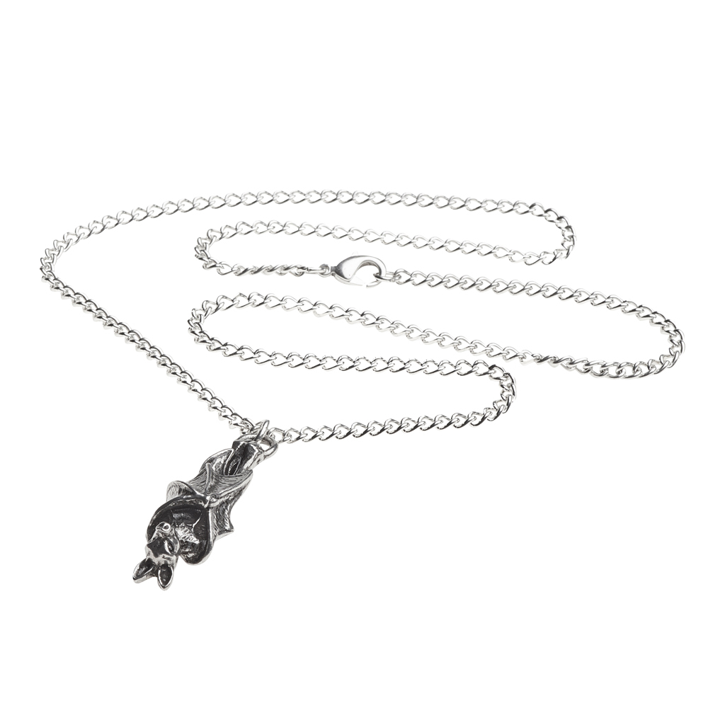 Вампир, молчаливый и неподвижный, предвосхищает сумерки перед последний лучом света, который должен угаснуть к закату - так что хищник выходит на охоту... Спящая летучая мышь, висит вниз головой. На 21-дюймовой (53 см) цепочке. Вес и размеры (приблизительно): H: 42 мм (1,65 дюйма) W: 13 мм (0,51 дюйма) D: 10 мм (0,39 дюйма) Вес: 18 г (0,63 унции)