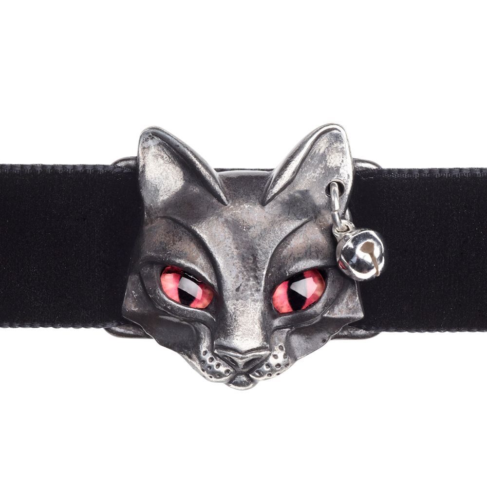 Чокер выполнен в готическом стиле, что придает ему особый шарм и загадочность. Черная бархатная лента шириной 23 мм украшена слайдером из пьютера в виде кошки с красными глазами, которые обладают эффектом слежения. Звенящий колокольчик, свисающий с одного проколотого уха, добавляет изысканности и оригинальности.