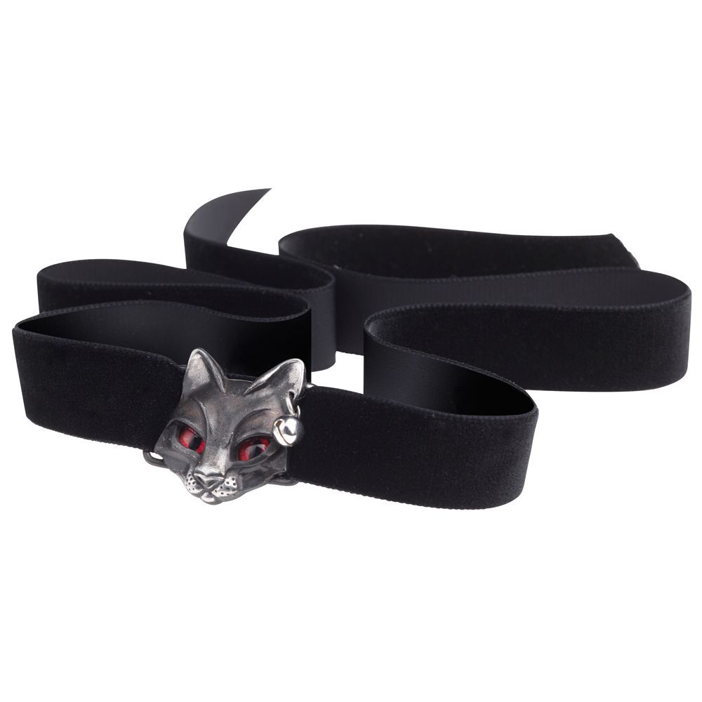 Египетская богиня Бастет, богиня любви и плодородия, которая изображалась женщиной с головой кошки, приносящая радость и веселье. Черная бархатная лента шириной 23 мм со слайдером из пьютера в виде кошки, с красными глазами с эффектом слежения и звенящим колокольчиком, свисающим с одного проколотого уха. Лента длиной 38 дюймов (1 метр), завязывается бантом.