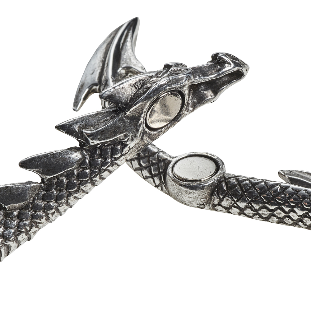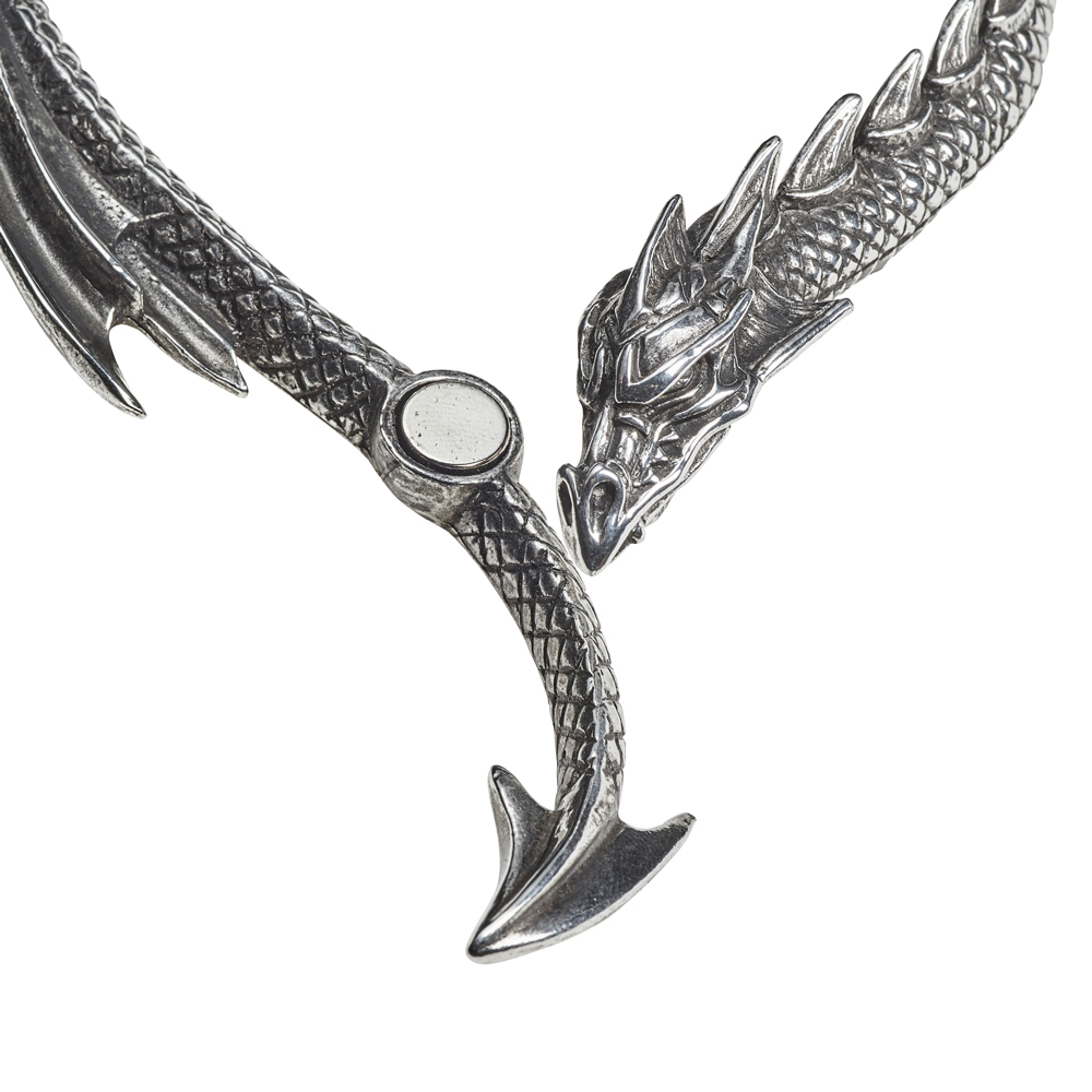 Подвеска Дракон. Подвеска на магнитной застежке, в форме дракона. Извивающийся, уникальный дракон, охотно доверившийся изменчивому образу жизни. Большое цельное, старинное ожерелье в форме дракона, на сплошной змееподобной цепи. Всего 19 ½" (49 см); нерегулируемое. Вес и размеры (приблизительно): H: 145 мм (5,71 дюйма) W: 96 мм (3,78 дюйма) D: 18 мм (0,71 дюйма) Вес: 159 г (5,61 унции)
