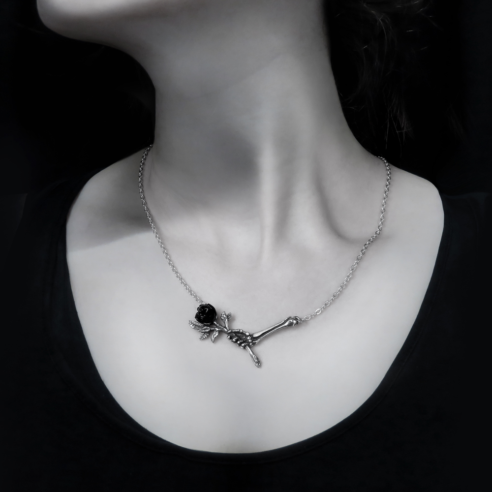 Небольшая подвеска из пьютера в форме руки скелета, предлагающее черную розу, на цепочке, общей длиной 20 дюймов (51 см). Вес и размеры (приблизительно): H: 39 мм (1,54 дюйма) W: 56 мм (2,20 дюйма) D: 12 мм (0,47 дюйма) Вес: 14 г (0,49 унции)