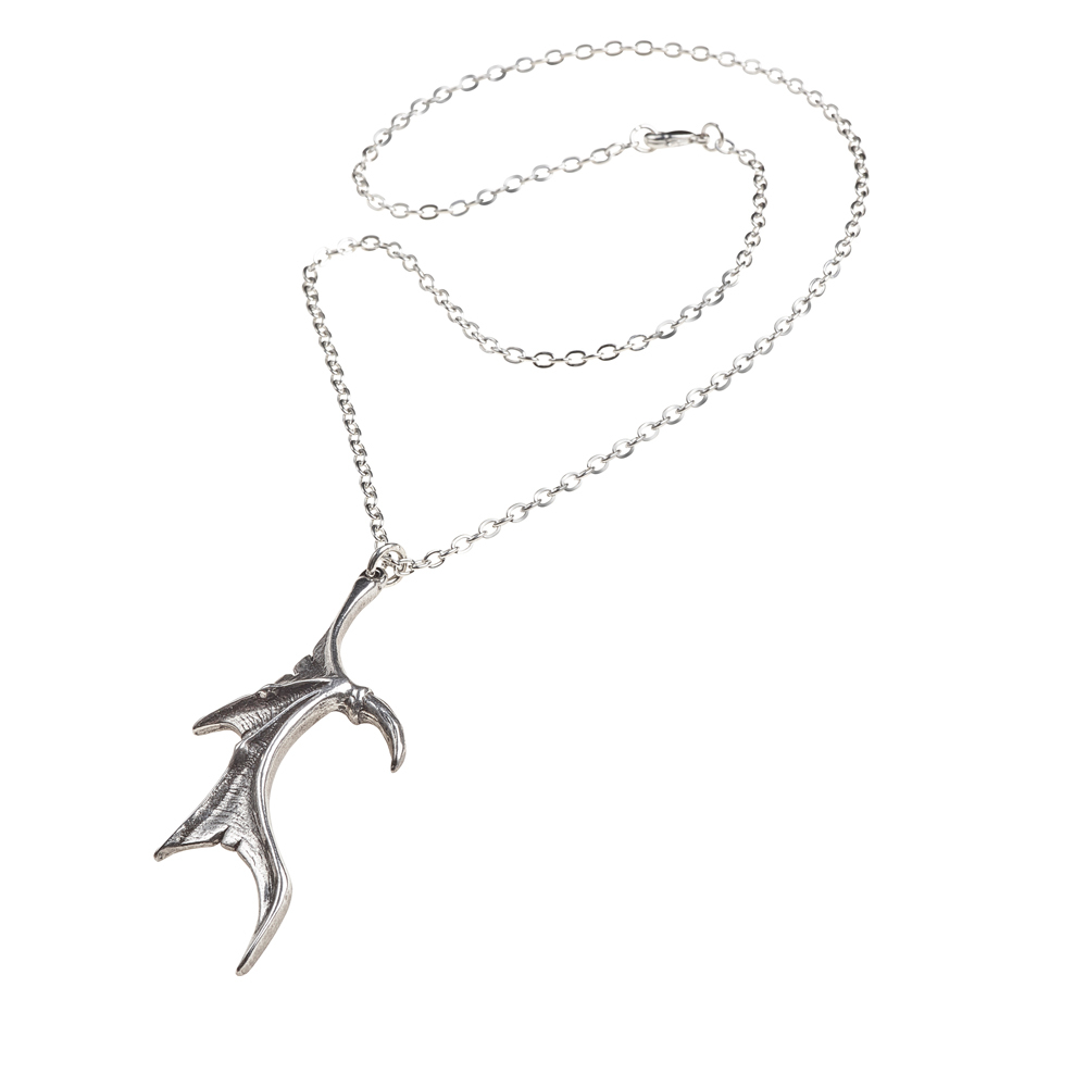 Дизайн подвески вдохновлен тематикой готики и представляет собой парные кулоны в форме крыльев дракона, которые скрепляются и образуют сердце. Изделие выполнено из сплава олова, что придает ему серебристый цвет и делает его легким и прочным.