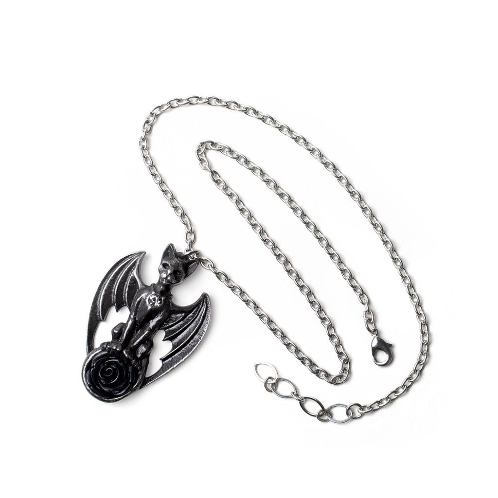 Статная крылатая черная кошка инкрустирована австрийским сверкающим черным кристаллом и большой черной розой, покрытой эмалью. Подвеска упакована в фирменный пакет Alchemy, включая гарантию Alchemy и инструкции по уходу.