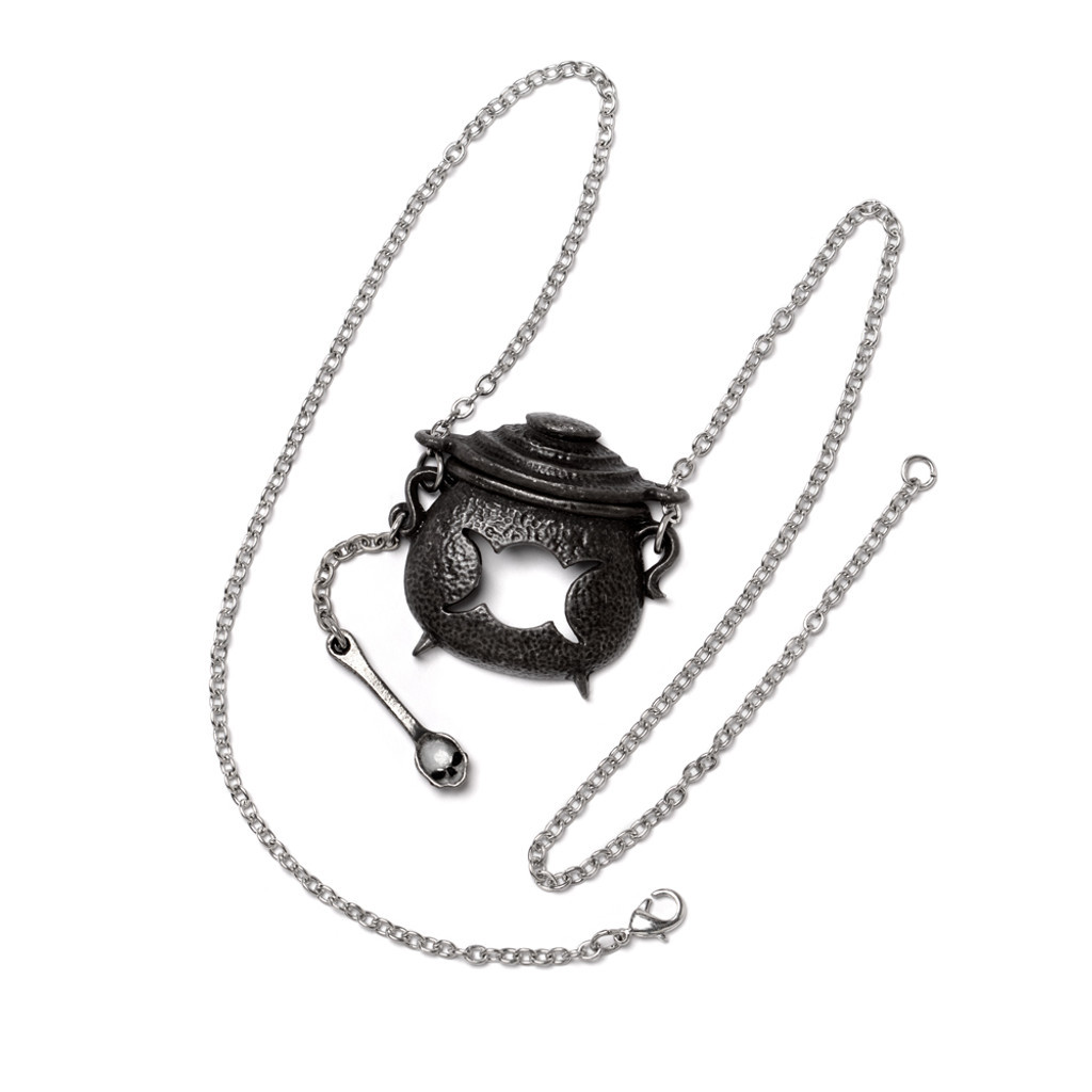 ВЕДЬМИН КОТЕЛ. Мистически зачарованный, черный чайник, снова создающий проблемы, - тонкое выражение вашей уникальности и замечательных талантов. Этот предмет будет на первом месте в списке желаний любой ведьмы!  Приготовьте особое колдовское угощение! Миниатюрное ожерелье в виде ведьминого котла, украшенного вырезанной деталью в виде тройной луны. В комплекте с подвижной крышкой и милейшим половником с изображением черепа! Размер (приблизительно): На 18-дюймовой (46 см) разъемной цепочке. Вес и размеры (приблизительно): H: 62 мм W: 36 мм D: 10 мм Вес: 23 г. Упаковано в фирменный пакет Alchemy, включая гарантию Alchemy и инструкции по уходу. Разработано и изготовлено вручную в Англии из тонкого английского пьютера.