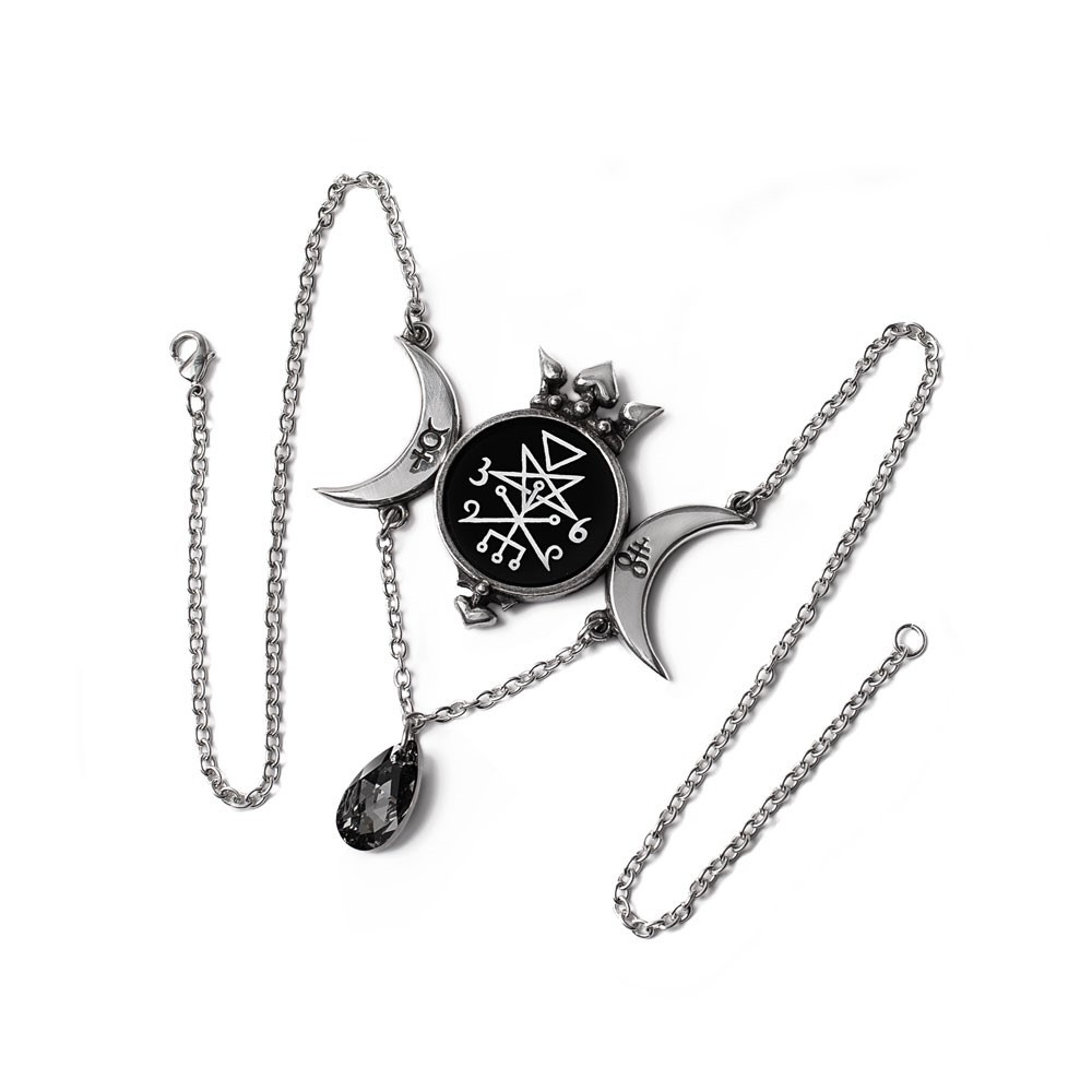 Кулон, увенчанный короной в виде тройной луны, символизирует связь с богиней-матерью и вечной цикличностью жизни. В центре украшения находится диск из черного оникса, на который с высочайшей точностью нанесены алхимические сигилы ртути и серы — элементы, олицетворяющие трансформацию и алхимию. Также на диске размещена загадочная печать Лилит, соединяющая вас с глубокими корнями древней мудрости и эзотерической красоты.