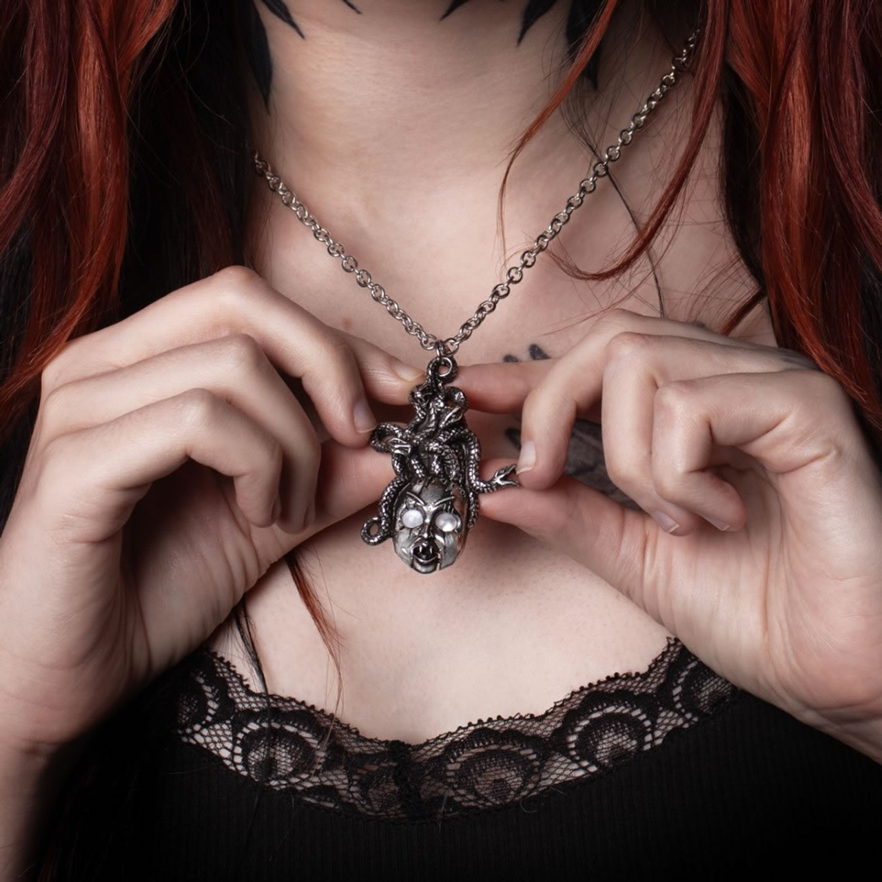 Кулон в форме головы куклы выполнен с поразительной тщательностью. Его жутко реалистичный дизайн и загадочный взгляд создают атмосферу интриги. Извивающиеся волосы куклы образуют гипнотические узоры, а переливающиеся перламутровые глаза излучают холодный, неземной свет. Подвижная челюсть добавляет уникальности, делая это украшение поистине запоминающимся.